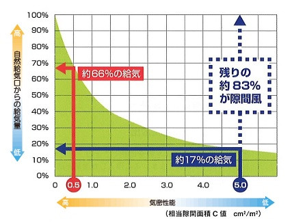 はがき5枚分の隙間にあたるC値5.0㎠/㎡のケースでは、家全体の給気は約80%以上が隙間風であるという調査結果にあるとおりです。