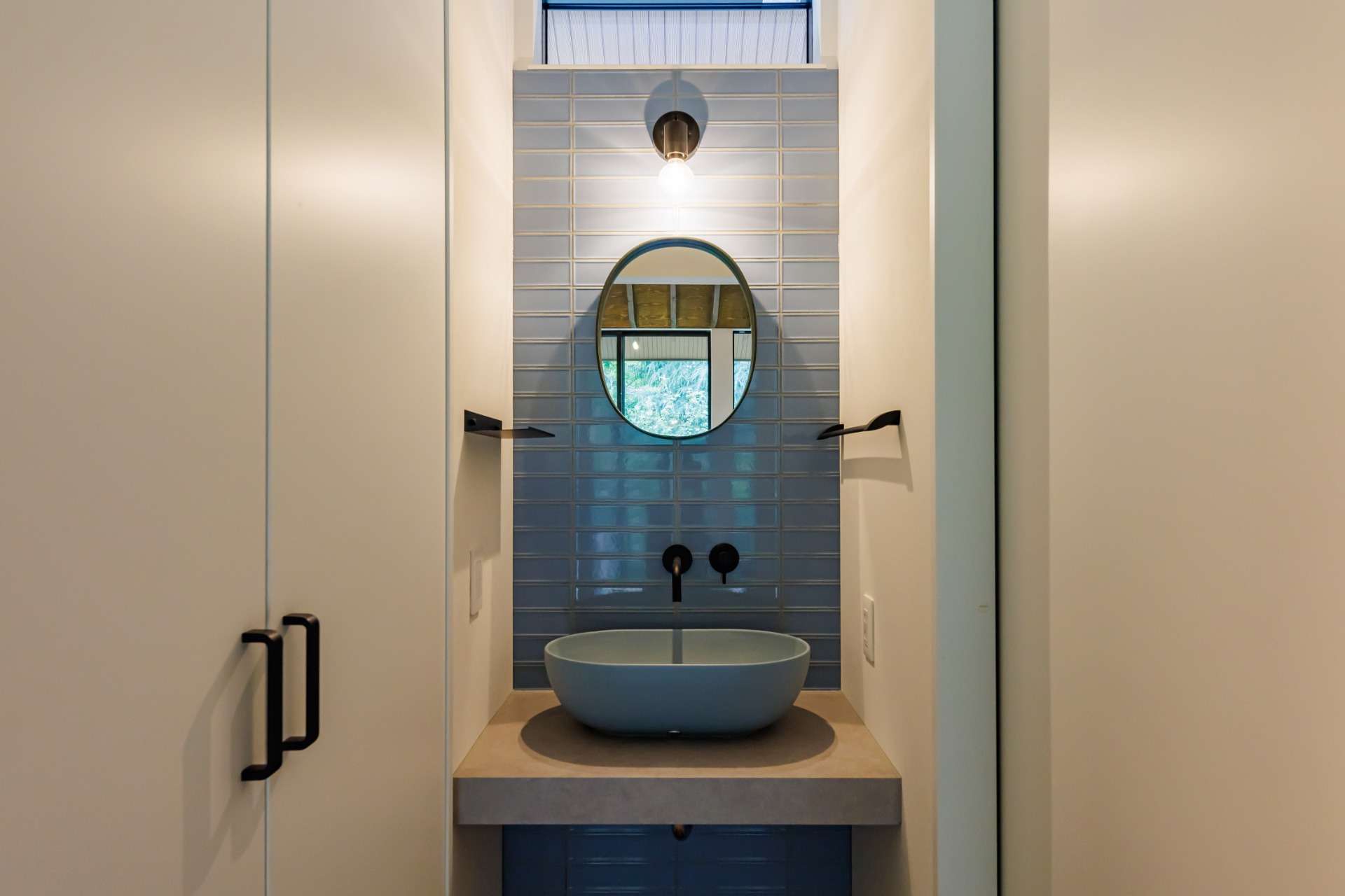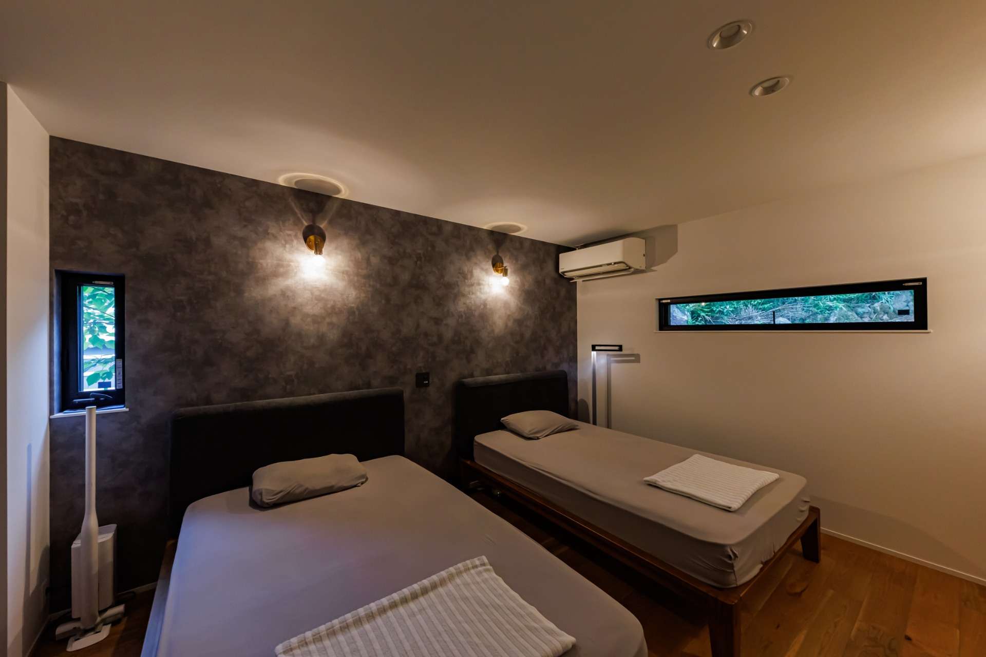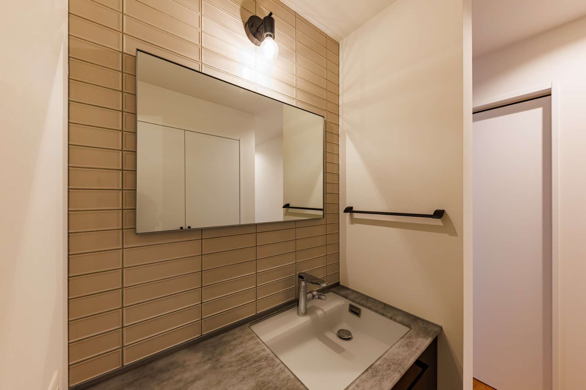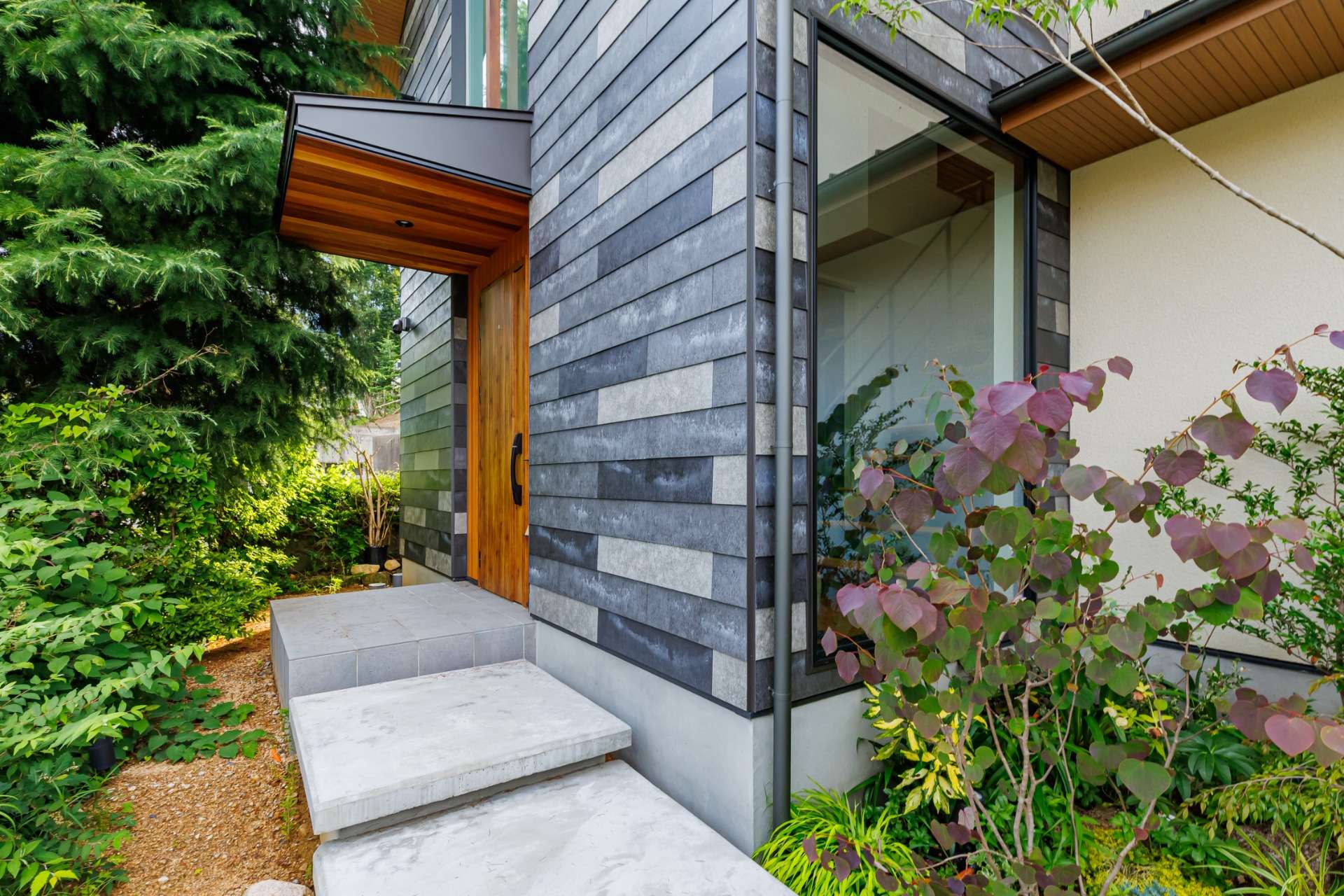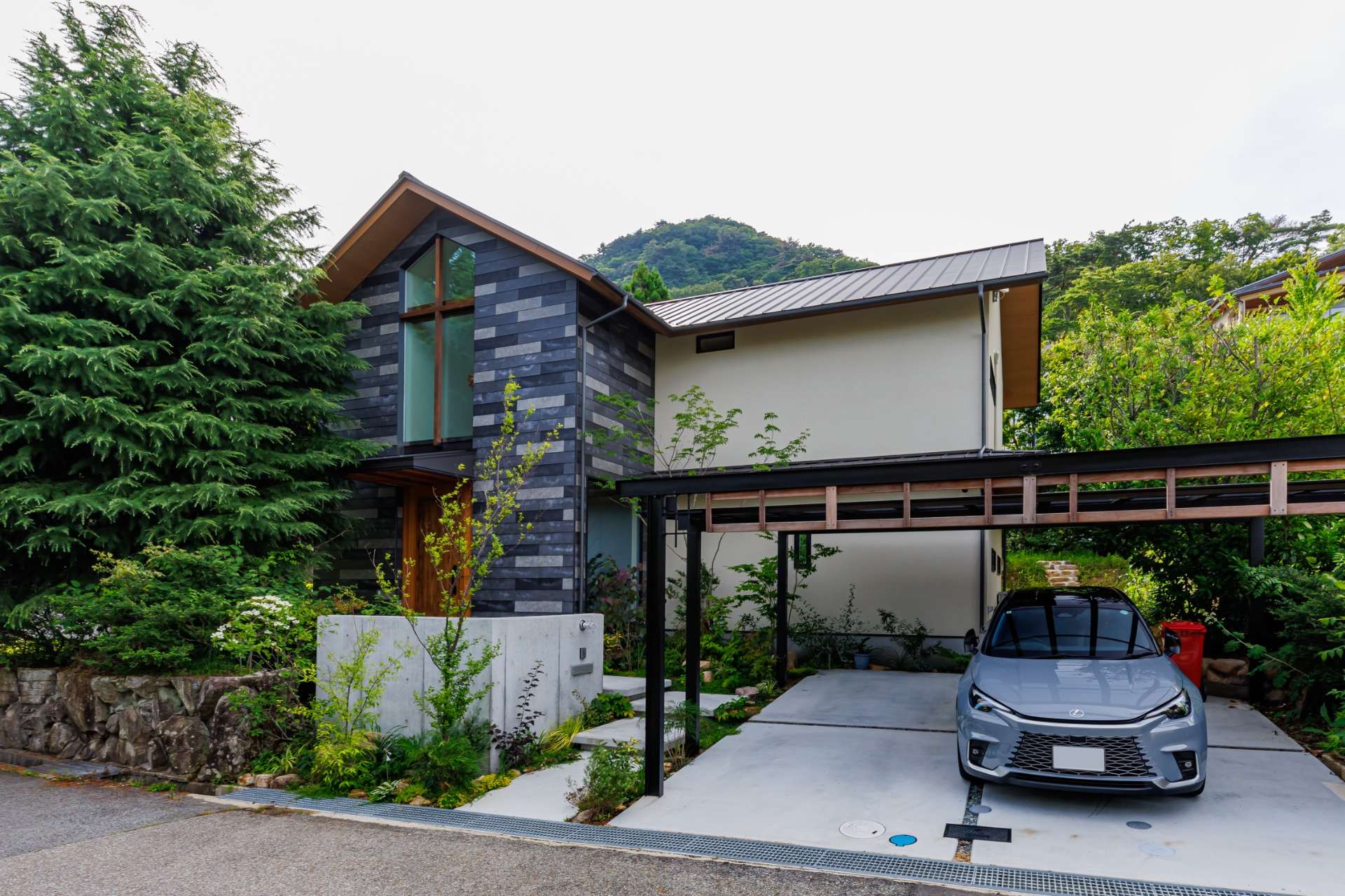 昼と夜で異なる魅力を見せる外観が特徴的。昼間は、タイル貼りのシンプルでモダンな外壁が、周囲の緑と調和し、自然の美しさを引き立てている。