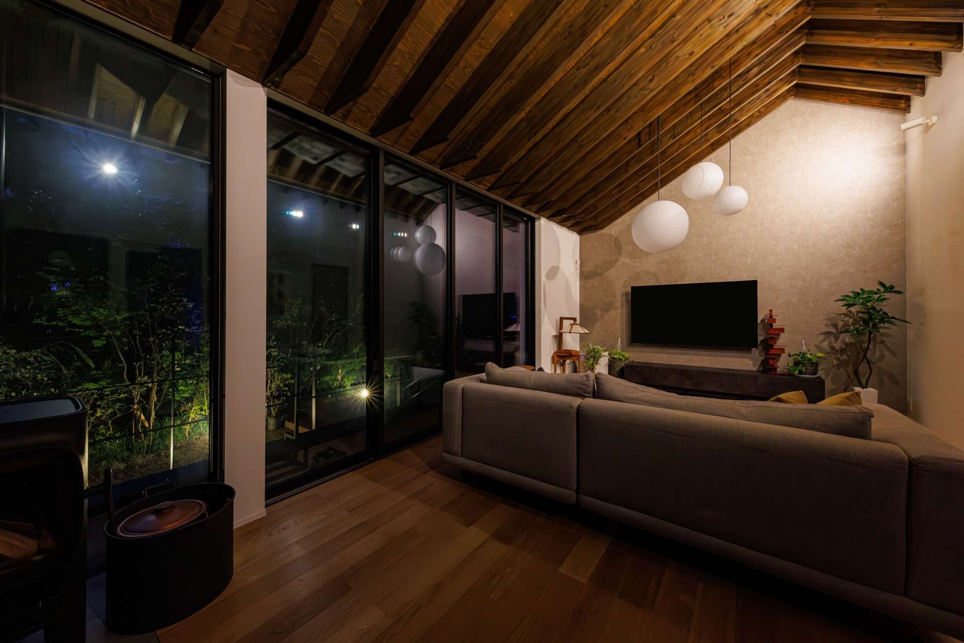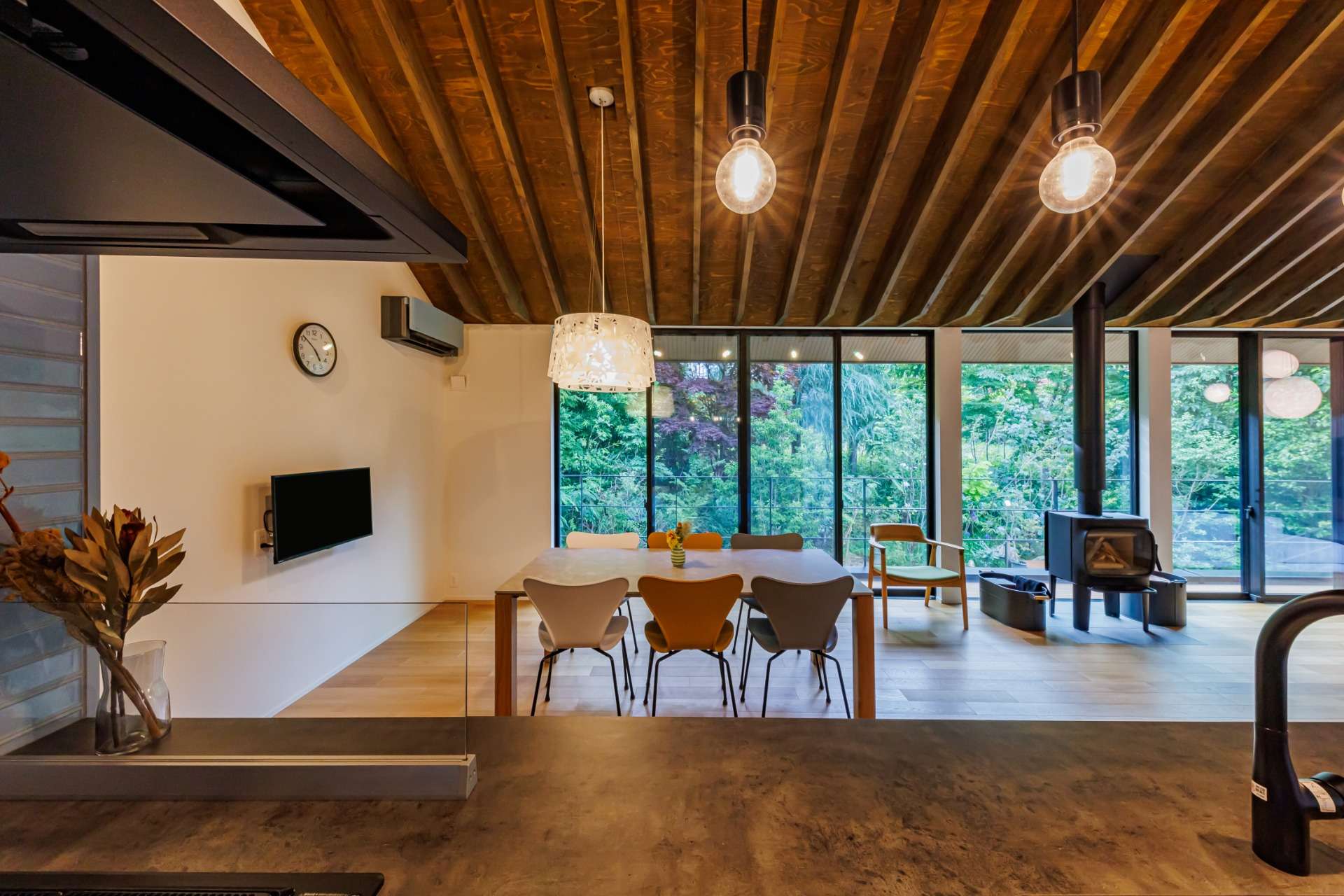 リビングダイニングの大きな窓からは、夜の風景も楽しむことができ、自然との調和が一層強調される。
