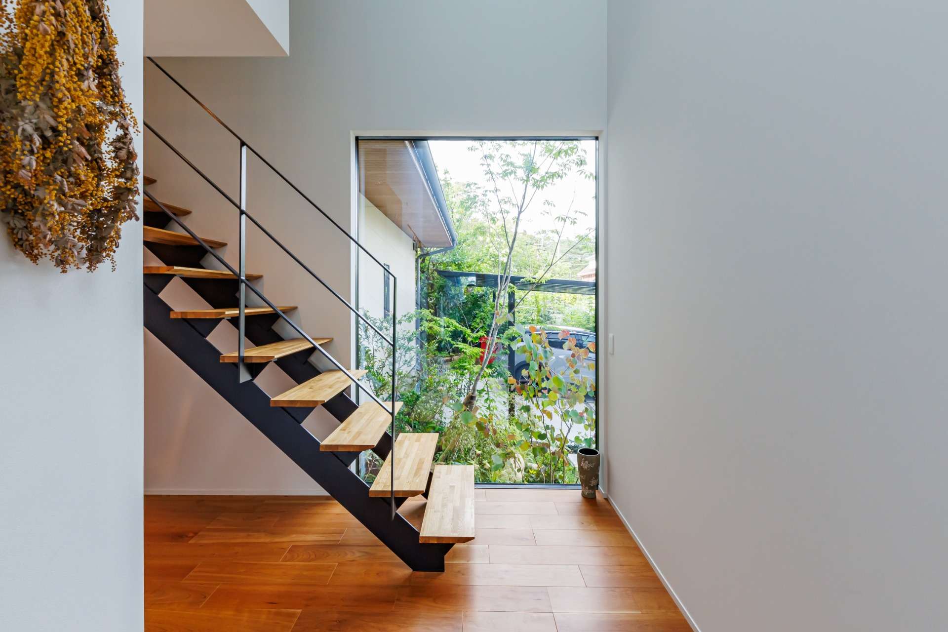 玄関の吹き抜け部分は、外観にもアクセントを与え、印象的な存在感を放っている。アプローチにはフロート階段を配置し、訪れる人々を迎える洗練された雰囲気が漂う空間に。
