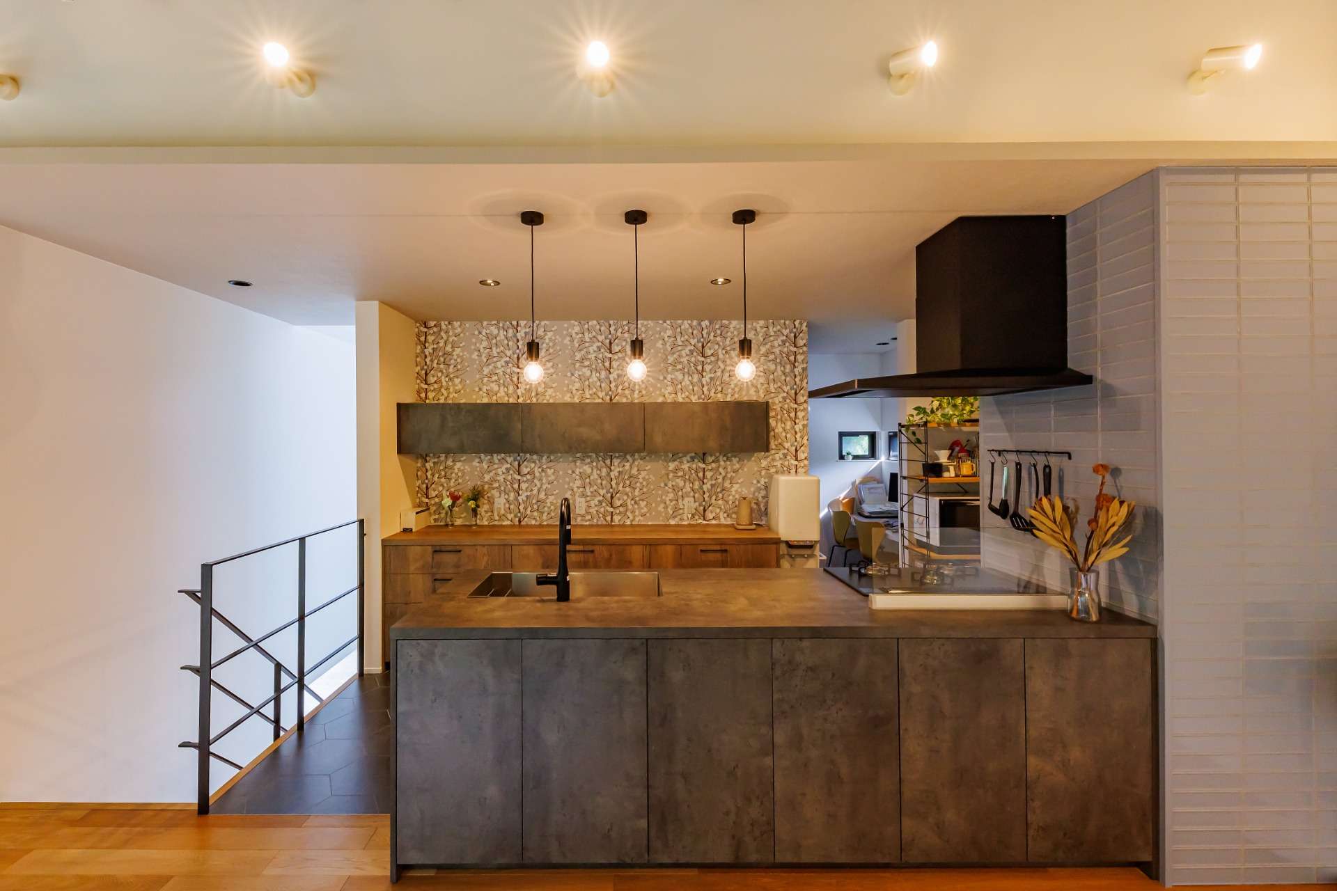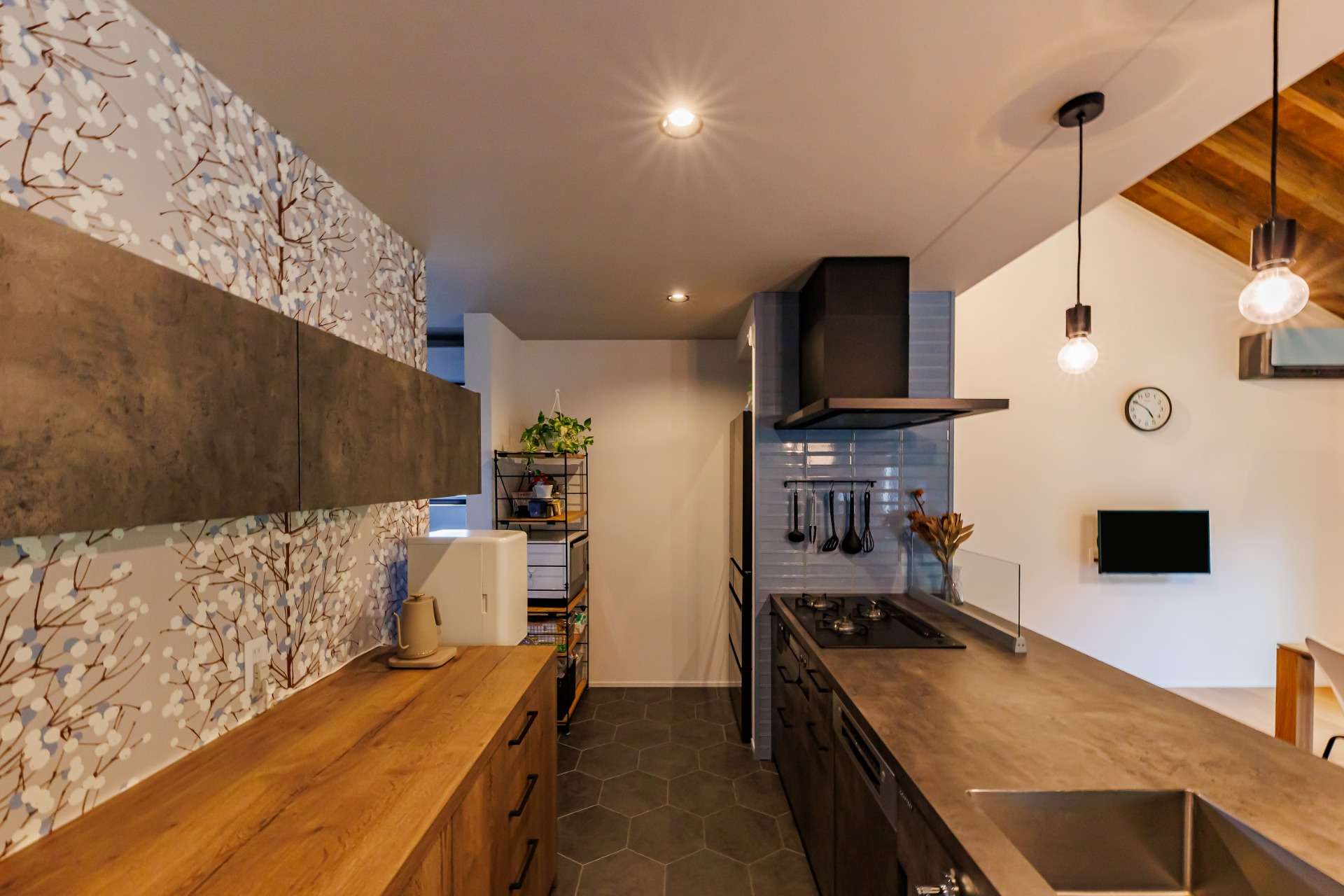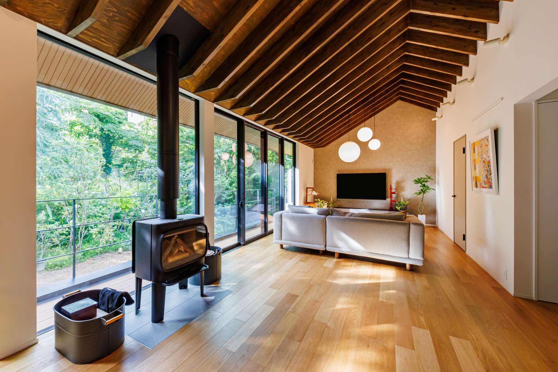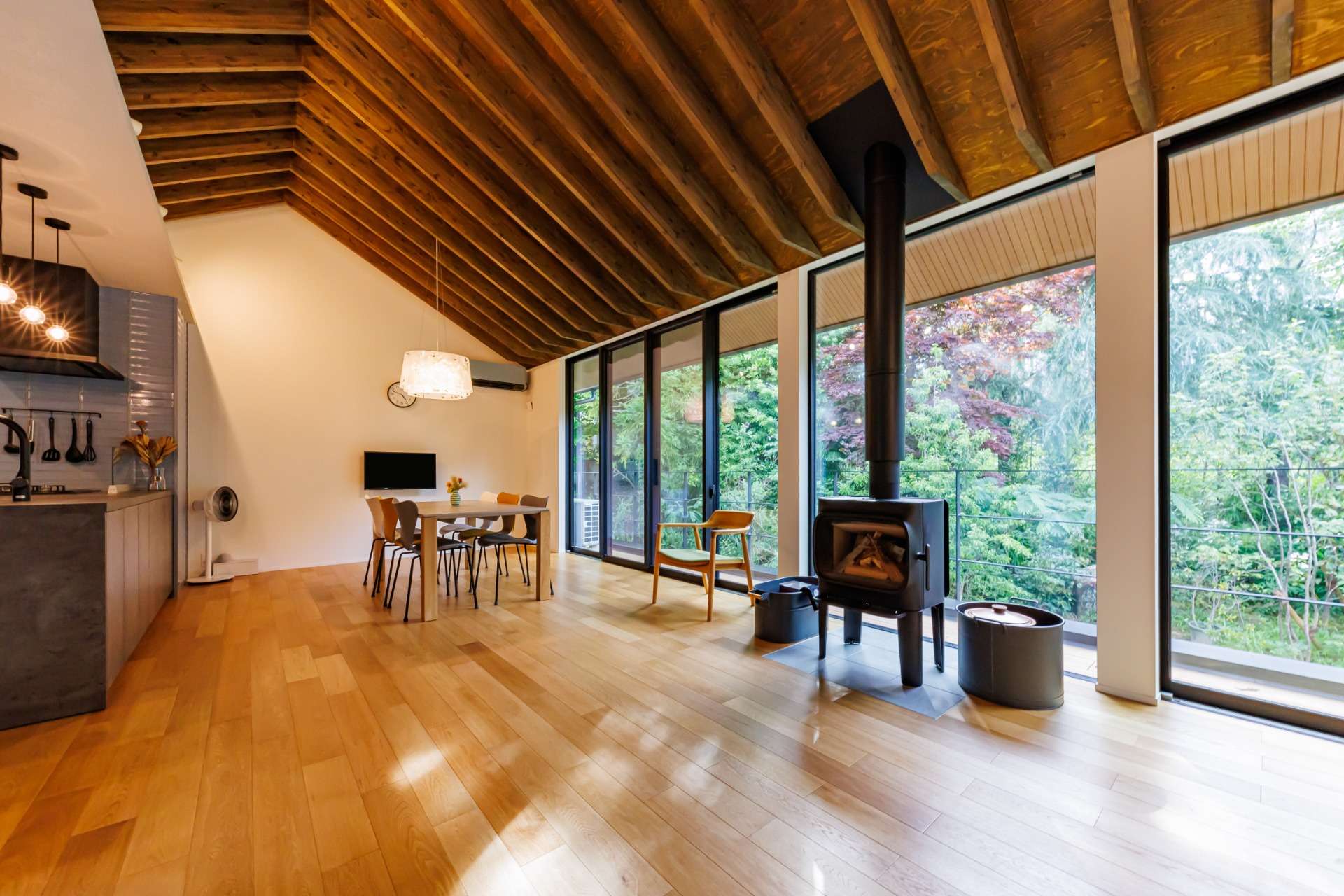 さらに、天井のデザイン梁が空間の個性を際立たせ、暖炉がその魅力をさらに深め、温かみと落ち着いた雰囲気が広がる空間に。