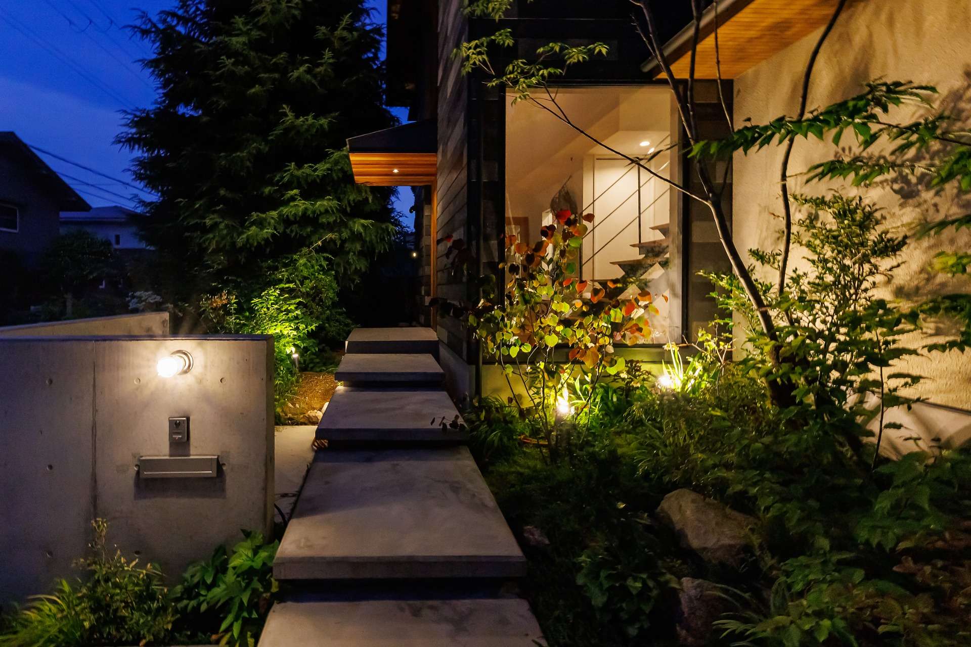 アプローチにはライトアップが施され、歩道や緑が幻想的に浮かび上がり、静かな夜の美しさを演出。