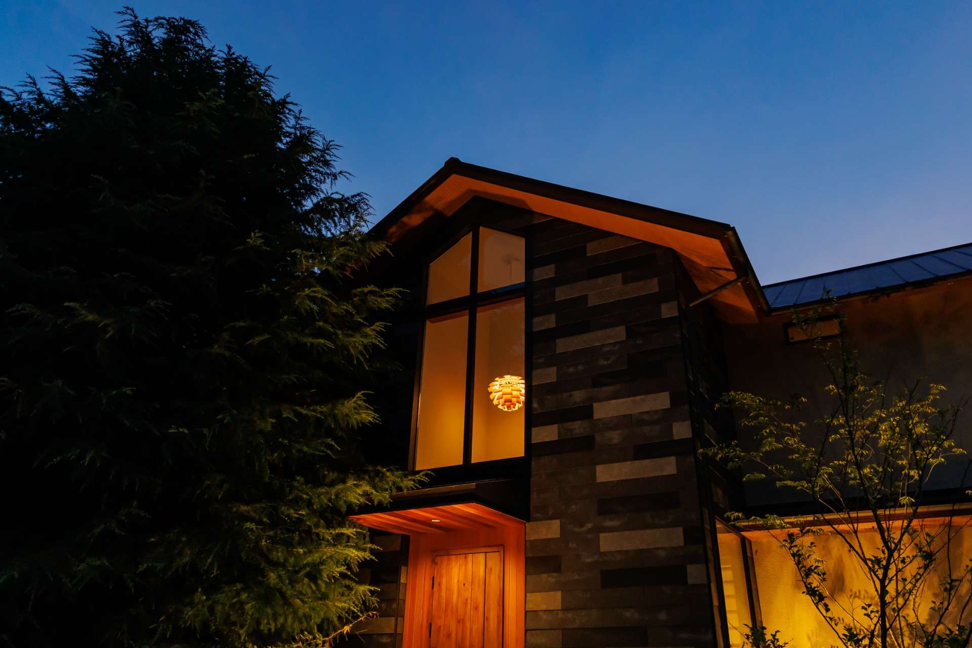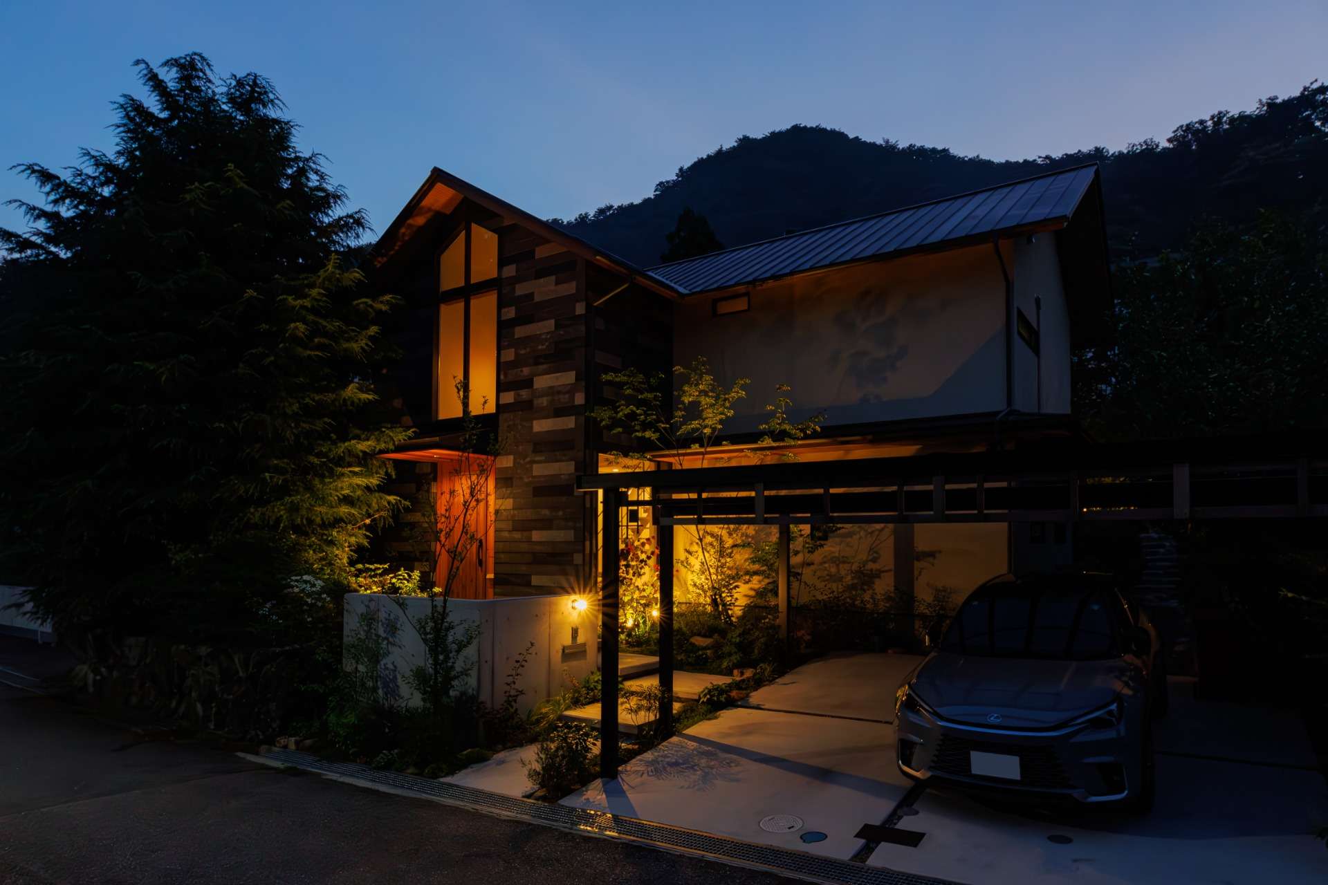 夜になると、外観はまた違った顔に。玄関の吹き抜け部分に設置された照明が外からも見え、帰宅時にはその温かい光が迎えてくれる。