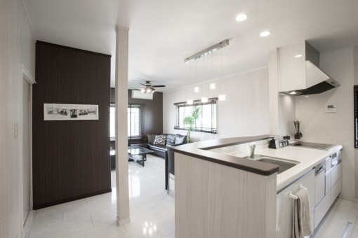 一例として、キッチンの腰壁やTVボードなどの箇所をコンクリートにすることにより、一層おしゃれな雰囲気を醸し出しながら蓄熱利用ができます。